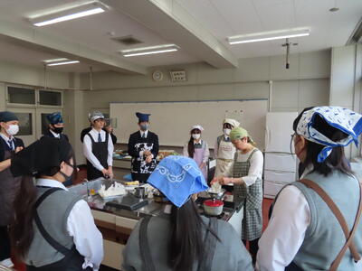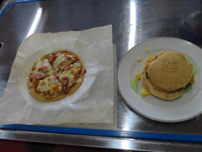 丸いピザ生地を大地に見立て、地元の食材をトッピングして仕上げます。グループに分かれ、ピザ生地から作りオーブンで焼きて完成です。ホットサンドも一緒に作り、完成後はみんなでおいしくいただきました!